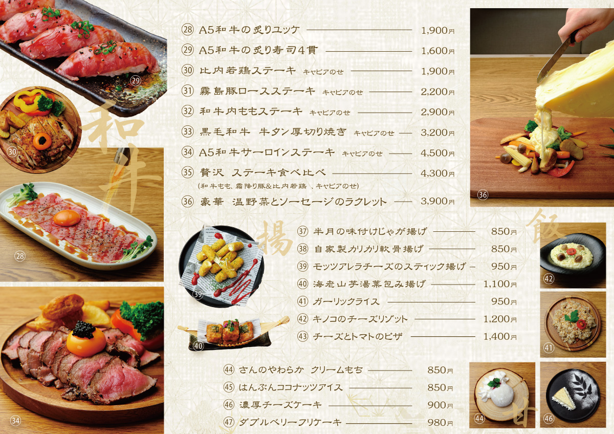 厳選した和牛・豚・鶏をそれぞれ最適な火入れで仕上げ、キャビアを添えた贅沢なステーキ食べ比べ。異なる旨みと食感が重なり、アルコールとの相性抜群!シェアして楽しめる華やかな一皿です。